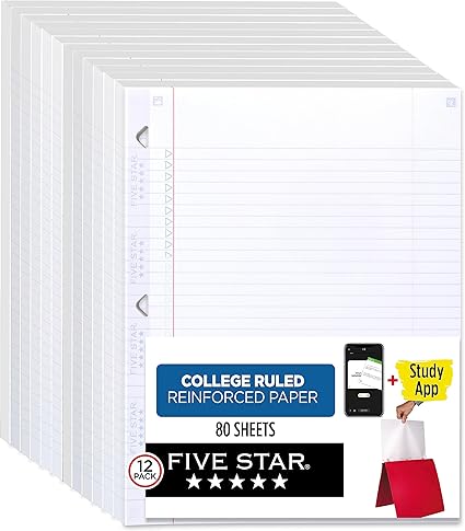 Five Star Loose Leaf Paper + Study App, 12 Pack, Notebook Paper, College Ruled Paper, 8-1/2″ x 11″, 80 Sheets per Pack, Reinforced Filler Paper (170026-ECM)